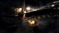 En route to Armistice Station, the Battlestars Myriad and Hydra encounter two Cylon Basestars. Strangely, both enemy vessels are travelling at sublight speeds, one some distance in front of the other. The Battlestars, both of which had received the CNP upgrade, are shut down instantly. The Hydra is destroyed by nukes while the Myriad, unable to change course, crashes into the lead Basestar. Miraculously, it survives, though the front third of the ship is little more than a fireball. Even more amazingly, as the launched Vipers are effortlessly eliminated by Raiders, Furik’s fighter alone survives the onslaught; he manoeuvres it back to the Myriad by manually firing his cannons, but not before he sees the Battlestar’s course: straight towards the uninhabited planet Minos.